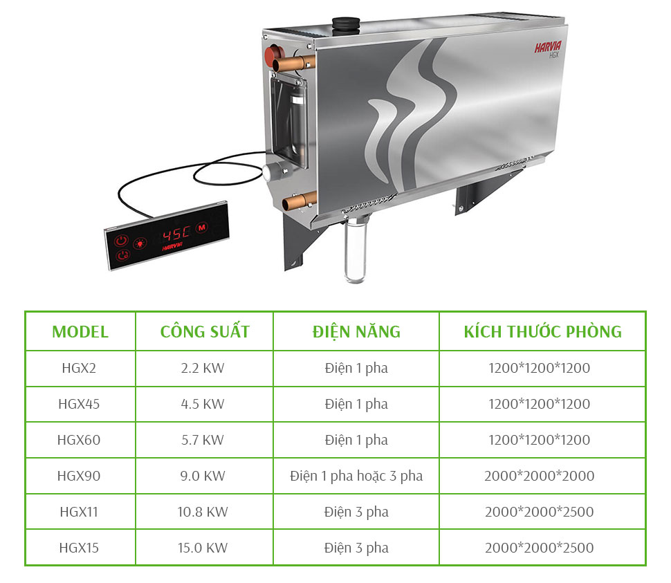 Đây là sản phẩm thuộc dòng máy xông hơi ướt. Có đa dạng các Model máy như: HGX2, HGX45, HGX60, HGX90, HGX11, HGX15….